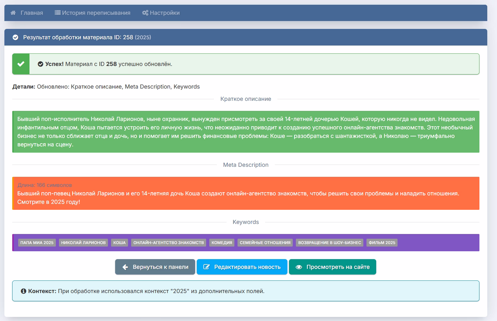 Заголовки (Title): Модуль способен переписывать заголовки новостей, делая их более привлекательными, кликабельными и оптимизированными для SEO.