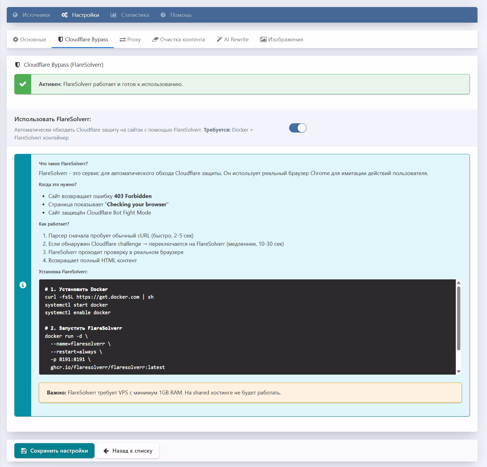 - Docker (для FlareSolverr)