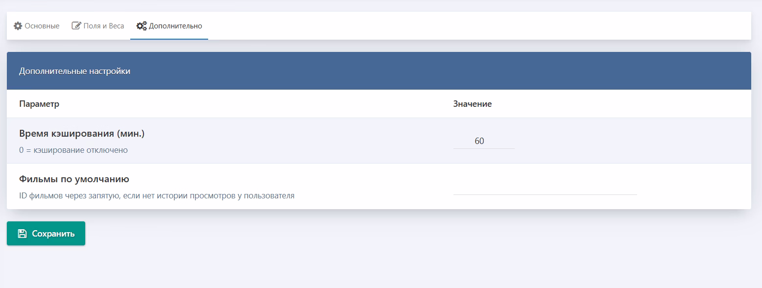 Исключение Категорий: Укажите ID категорий, фильмы из которых никогда не будут отображаться в рекомендациях, независимо от алгоритма.